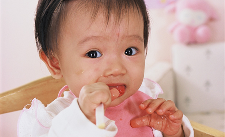 當我們拿零食往嘴裡送時,這才發現,小寶寶早已盯著你好久,小嘴巴也跟著咀嚼起來,看他認真又無辜的模樣,簡直要笑翻了。 寶寶開始吃副食品之後,對「吃」就會逐漸感興趣,記得要用小湯匙來餵食,這樣可以增進孩子的吞嚥與咀嚼能力,這些口腔活動對於日後的語言學習都有關鍵性的影響,父母千萬不要忽略,或是因為懶惰而疏於調製副食品。 除了調製的副食品之外,這時也可以為寶寶準備一些適合食用的嬰兒餅乾,在正餐之外,鼓勵他自己抓握、將食物送進嘴裡、學會囓咬與吞嚥,這些能力的培養非常的重要。只是,寶寶的消化功能尚未健全,所以選擇食物一定要謹慎,避免食用成人的食物或零食,盡量餵食柔軟易消化的食物類型,鼓勵寶寶細嚼慢嚥。此外,為了及早培養寶寶良好的餐桌習慣,請盡量讓他在固定的地點、時間進行,養成他良好的進食習慣。